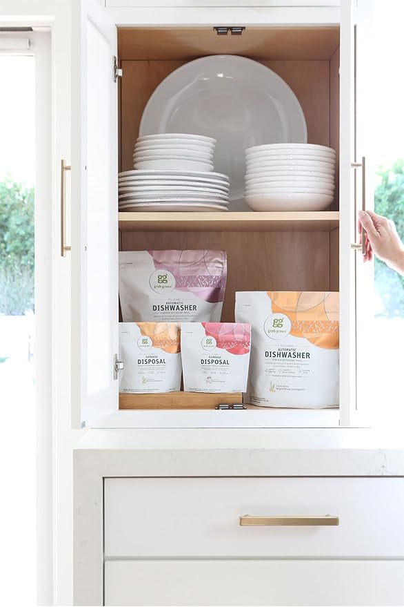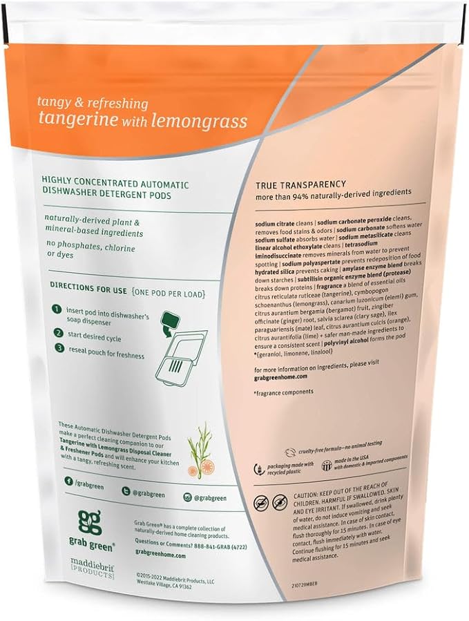 - Contains: 1- 24 Pod Bag of Grab Green Natural Tangerine with Lemongrass Automatic Dishwashing Detergent Pods. Our velcro closure bags are convenient and easy to use, no hassling with frustrating zip closures