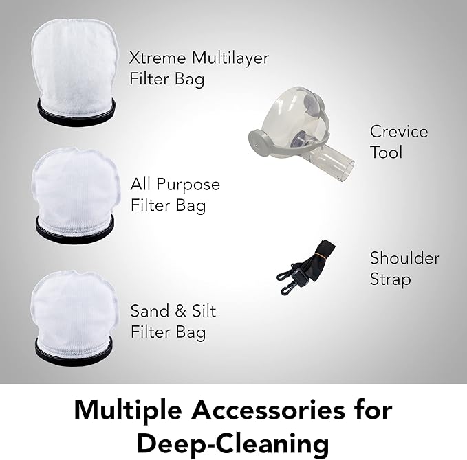 - WHATS INCLUDED: (1) 14.9" Vacuum Head w/Soft-Bristle Brush, (1) 14.5" Gunite Vacuum Head w/rollers, (1) Vacuum Head Adapter, (1) Wall Charger, (1) X-Treme Multilayered Filter Bag, (1) Sand & Silt Filter Bag, (1) All Purpose Filter Bag, (1) Sealed Lithium Ion Battery, (1) Shoulder Strap
