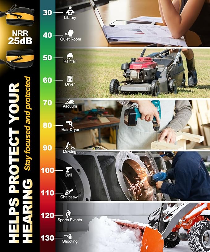 - Effective Noise Reduction & OSHA Compliant:Certified with a 25dB NRR, these digital radio earmuffs provide dependable hearing protection and comply with OSHA safety requirements. Enjoy clear radio or podcast audio while staying focused in loud environments like mowing, woodworking, welding, snow blowing, landscaping, and other noisy tasks. A practical and thoughtful gift for anyone who works with loud tools or enjoys DIY projects