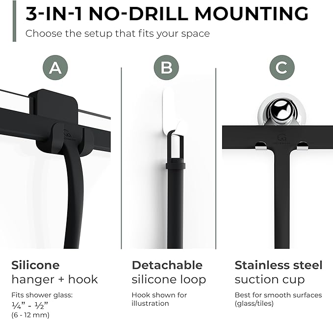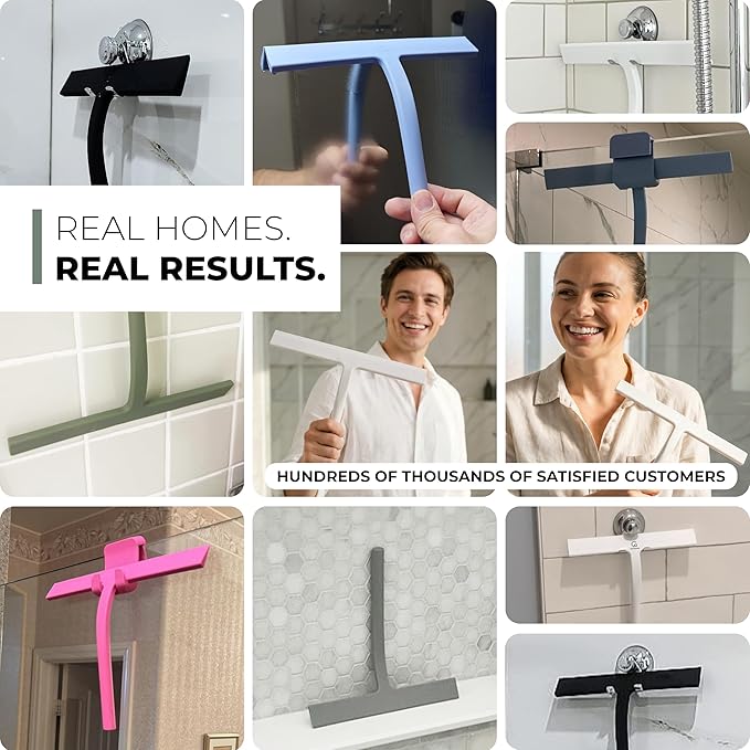 - SUPER STRONG SUCTION HOOK - No drilling or gluing required! You can easily remove and reattach the squeegee stainless steel hook to smooth surfaces such as panes, tiles, shower walls, shower glass surfaces, doors, cubicles, and enclosures.