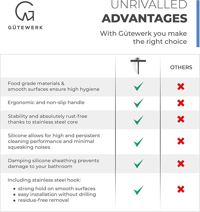 - MINIMALIST TIMELESS DESIGN - The GÜTEWERK glass squeegee is crafted with a matte black finish that impresses with its elegant timeless and smart design. In addition, the chrome-colored stainless-steel hook integrates well with any modern bathroom.