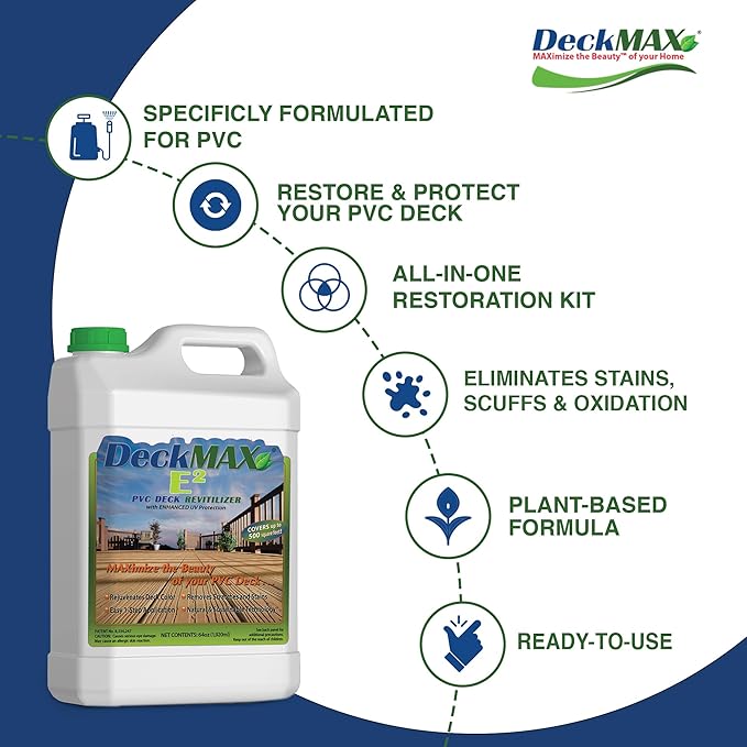 - Half Gallon Covers Up to 500 Sq. Ft.: A little goes a long way. Each half-gallon of E2 PVC Revitalizer efficiently refreshes PVC, composite decking, and vinyl fence sections—perfect for large deck, patio, or railing restoration projects.