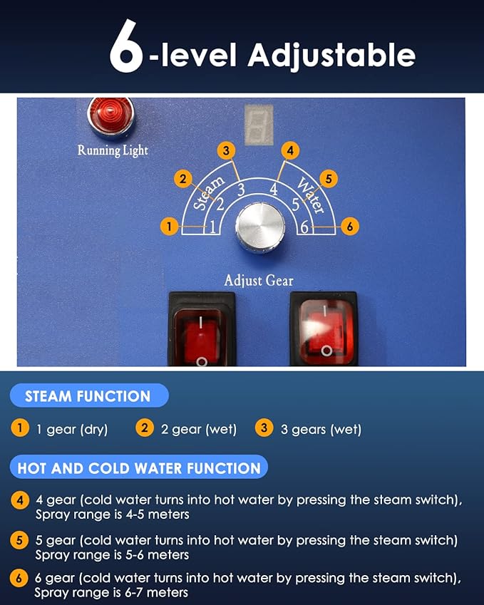 - [About Steam Function] After turning on the machine, first press the switch on spray gun to make running light on, and select 4 level to spray cold water. Then press spray gun switch again to make running light off, Now the steam switch can be turned on and start to use the 1-3 level Steam Function.