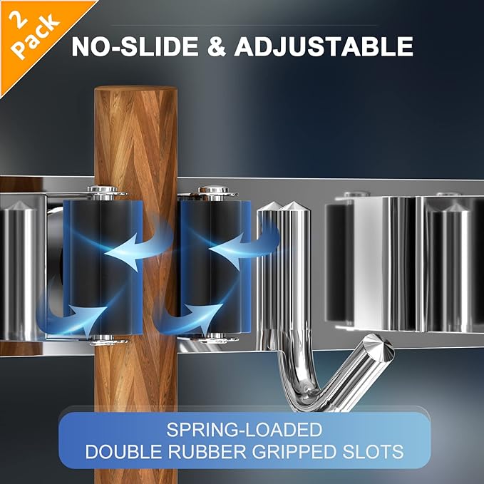 - 🏡【NON-SLIDE DESIGN】Each rack of the broom and mop holder wall mounted features an adjustable triangular design. The spring-loaded, double rubber gripped slots can keep a stronger hold on your items with diameter of 0.7 inch-1.3 inch. Whether wet mops or baseball bats, nothing slips.