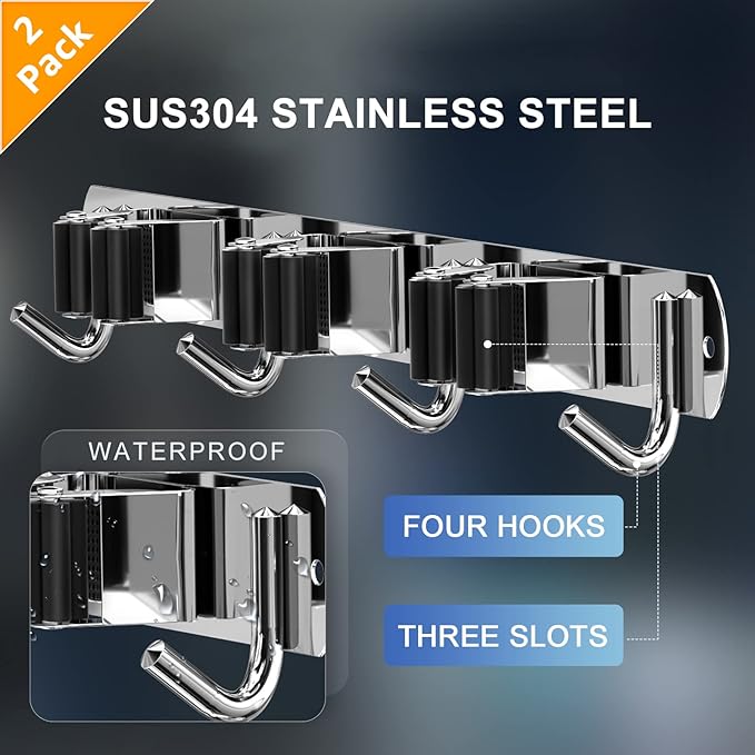 - 🏡【STURDY BROOM HOLDER】Each broom holder wall mount has 3 racks 4 hooks. Made of sturdy 304 stainless steel, the broom holder is corrosion-resistant, rustproof and waterproof. Compared with the plastic broom rack, it is more stronger and has a longer service life.