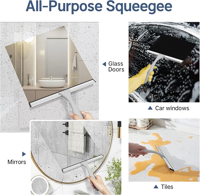 - ALL PURPOSE SQUEEGEE: The wide silicone blade helps you remove water and foam easily. The shower squeegee is great for cleaning shower doors, windows, mirrors, tiles, car windows, or any smooth and flat surfaces you may want to clean.