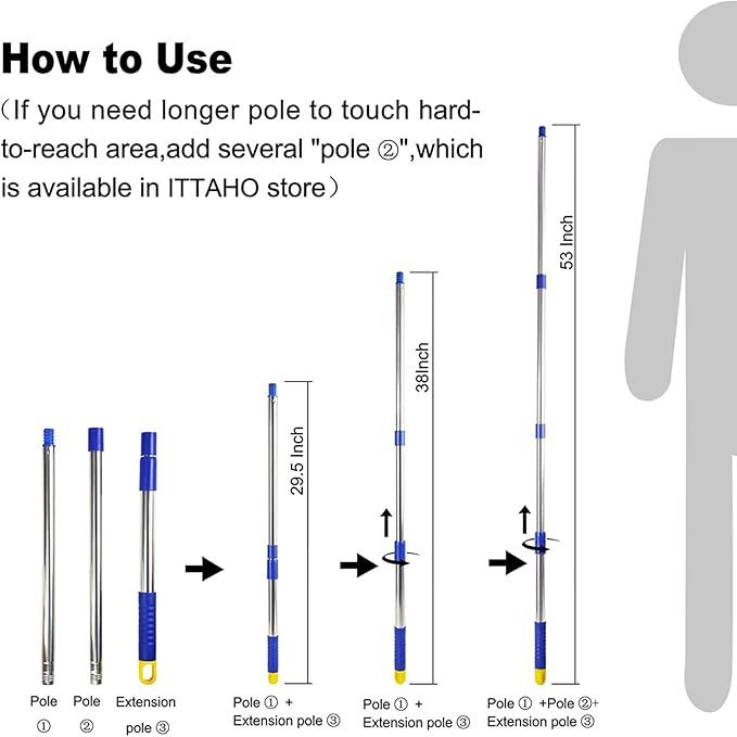 - 53 Inch Stainless Steel Pole: Desired household window washing kit with 3 section of extension poles, you can adjust the length according to your needs.Durable and sturdy stainless steel for hard cleaning work.All purpose squeegee for auto,car windshield glass,household high window cleaning,indoor and outdoor cleaning