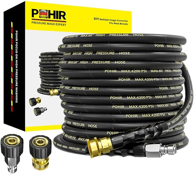 POHIR Pressure Washer Hose 50 ft with 3/8 Inch Quick Connect, Kink Resistant High Tensile Wire Braided,with 2 pcs M22 14mm Adapter Set, 4200 PSI Power Washer Hose