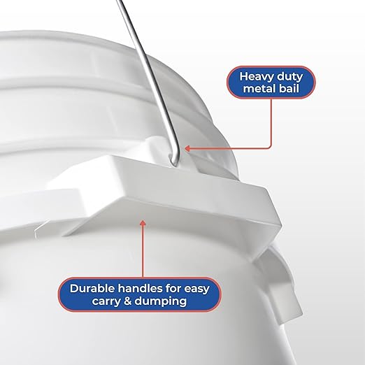 - Included metal bail and plastic hand-grip along with side handles makes this bucket easy to carry and dump