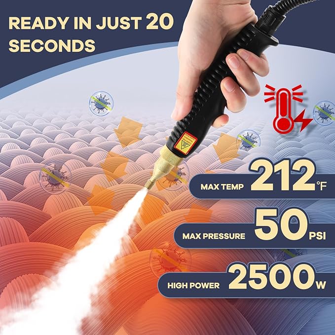 - [2500W Power Steamer] The temp is as high as 212 ℉, which can easily dissolve the greasy dirt and kill 99.99% of the invisible Vir and Bact. Note: the steam temp is the highest at the nozzle, and the temp will drop rapidly after 1 inch away from the nozzle.