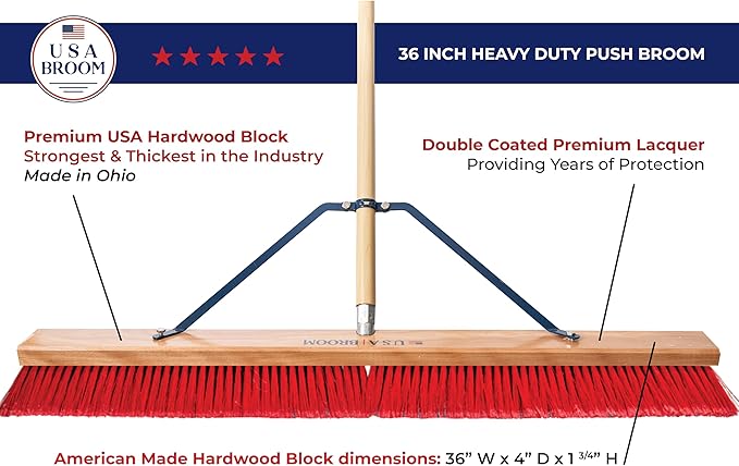 1-Pack - 36" Everyday Sweep Indoor/Outdoor Push Broom with 60" Handle. Ideal for Garages & Shops. Durable American Made Steel Brackets-All Stainless Steel Hardware. No Plastic. 100% USA Made