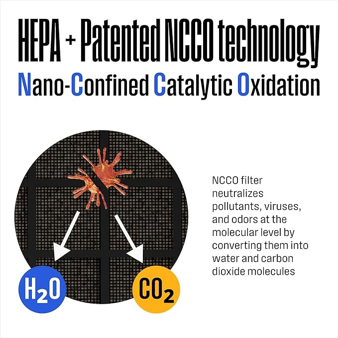 - PATENTED NCCO TECHNOLOGY: Bring home the proven (and patented) NCCO technology that’s used in hospitals around the world. It sanitizes your house and kills and removes harmful pollutants, breaking down the harmful particles in the air into harmless compounds and is more effective than a charcoal filter.