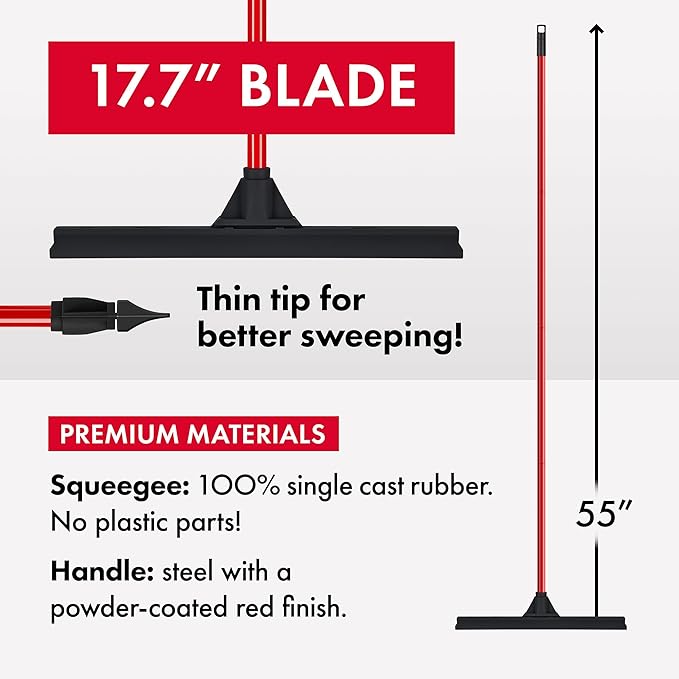 - QUICK DRYING ACTION: With the blade measuring an extra-wide 17.7 inches, this big wiper squeegee dries a huge area with every pull, allowing you to finish the work much faster. The high-quality rubber blade also prevents spots, saving you the hassle of additional drying using towels or mops.