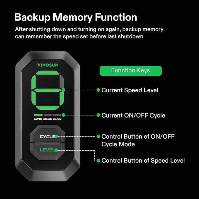 - E12 Speed Controller: Ten fan speeds controlled by PWM can be selected by you; Turn off and then on again, backup memory can remember the speed set before the last shutdown; Three ON/OFF cycle mode can achieve the cycle of wind speed to save power