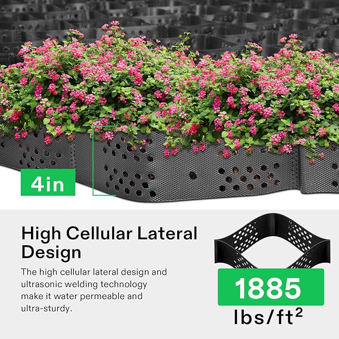 - Strong Support: The high cellular lateral design and ultrasonic welding technology ensure the geo grid is water permeable and ultra-sturdy; The three-dimensional honeycomb structure distributes up to 1885 lbs/ft2, supporting heavy foot traffic for years to come