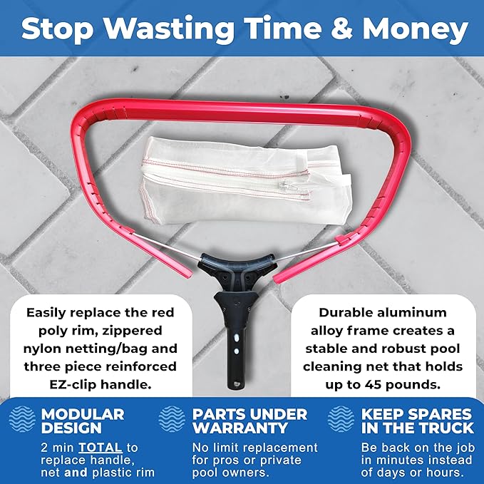 - NEARLY ELIMINATE DOWNTIME DUE TO BROKEN TOOLS - Keep an unlimited number of pool skimmer net part replacements (handles, nets, rims) in your truck (all at half off retail) for quick and easy on-site tool repairs. Stay on the job, making money and working hard for your clients.
