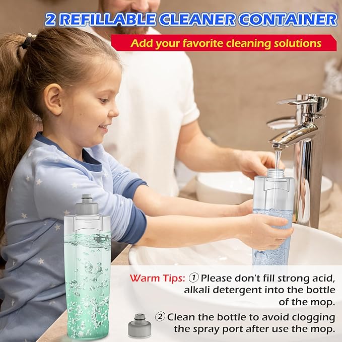 - MEXERRIS Tips:③Please don't fill boiling or impurity water, strong acid,alkali detergent into the bottle of the wet mop.④Please fully dilute solutions with plain water,because concentrated solutions may corrode mop internal parts or some floor types. ⑤ There are two small silicone plugs on the bottle cap of our spray mop. Please be careful not to lose them when cleaning the bottle to prevent the bottle from leaking.