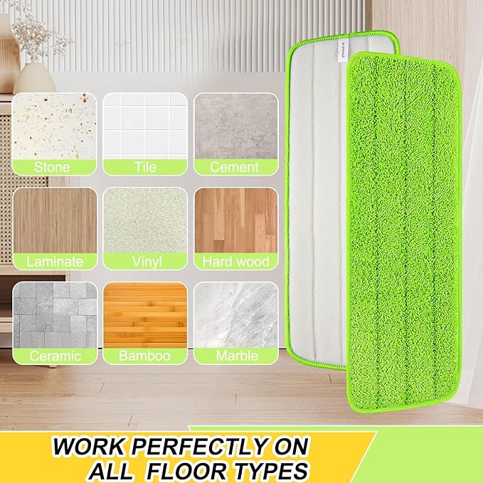 - Superfine Microfiber - Our spray mop heads adopt the high quality microfiber whose decontamination ability is further improved, fully absorb pet fur, hair, debris, dust, oil or other stubborn stain, durable and reusable.