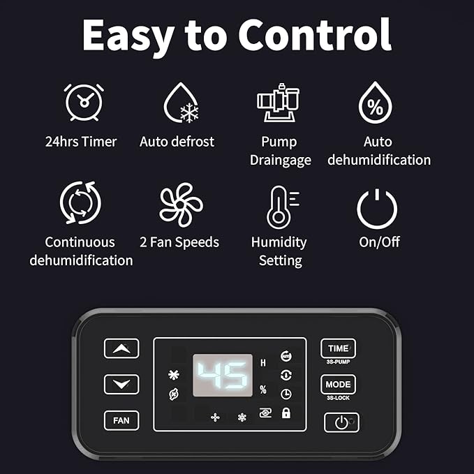 - Special Feature : Adjustable Humidity Control,Anti-Spill,Automatic Defrost,Automatic Moisture Removal,Automatic Restart,Automatic Shutoff,Bucket Storage,Child Lock,Continuous Draining,Detachable,Digital Display,Digital Display,Ergonomic Handle,Portable,Quiet,Operation,Removable Tank,Timer,Washable Filter,Built-in Pump Adjustable Humidity Control,Anti-Spill,Automatic Defrost,Automatic Moisture Removal,Automatic Restart,Automatic Shutoff,Bucket Storage,Child Lock,Conti… See more