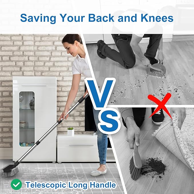 - Extendable & Adjustable Grips Handle: Floor scrubber brush comes with 3-section stainless steel poles, 1 telescopic and 2 extended and a 2-in-1 cleaning brush head. Allow you adjust the length according to your need. Total 53" long handle scrub brush keeps your far away from pains, saving your back and knees.