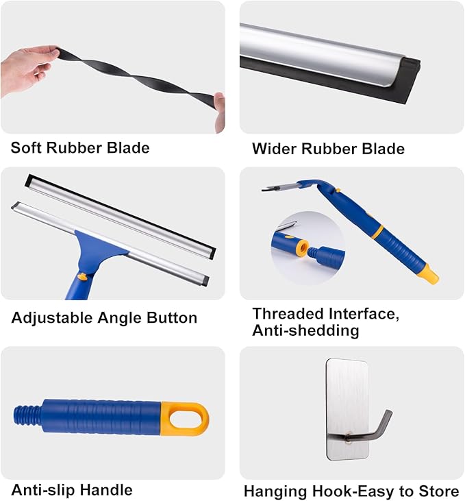 - Versatile Cleaning Tool: The multi-purpose squeegee for shower glass is a great cleaner kit for indoor and outdoor. Our window squeegee has perfect size and effectively apply for cleaning bathroom glass doors, windows, tile, fogged mirrors, kitchen, countertop, car windshield, shower walls and other smooth & flat surfaces.