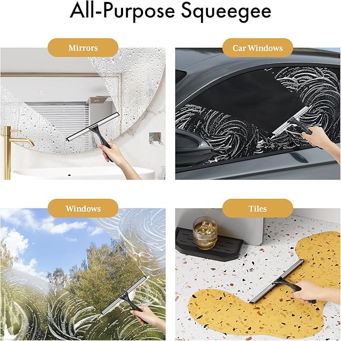 - All-Purpose Squeegee: The wide silicone blade effortlessly removes water and foam from various surfaces such as shower doors, windows, mirrors, tiles, and car windows. Its versatility makes it a go-to tool for all your cleaning needs on smooth and flat surfaces.