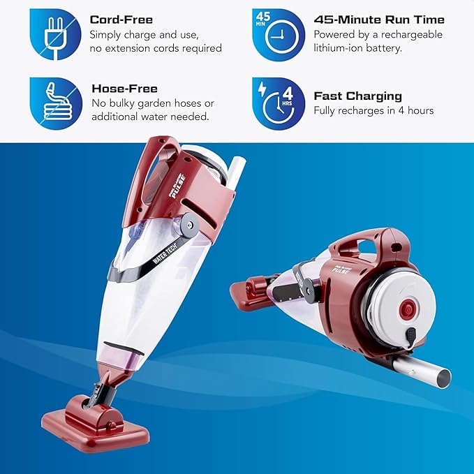 - Quick Clean Convenience – Cordless operation glides easily through smaller pools, collecting sand and silt without hoses or cords, ideal for quick weekly maintenance and fast touch ups before a swim.