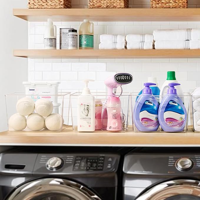 - Functional Storage for Any Space---You can use these pantry bins for various things throughout your home to organize and make your life easier. They are fit to pantry organization,ideal for closet, cabinet, kitchen, bathroom,under sink,laundry room and cube storage.The clear organizing bins to store drinks, snacks, cans,toys,lotions, cleaning supplies and toilet supplies.