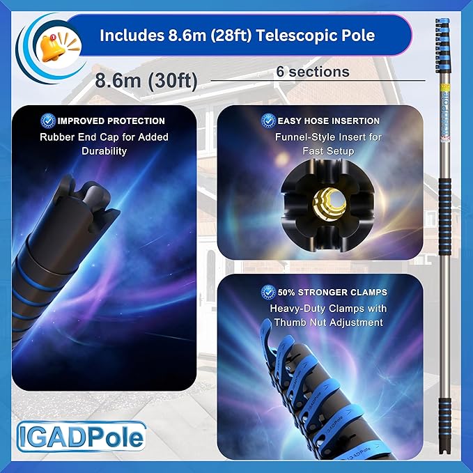 IGADPole 28 FT Water-Fed Washing Kit with Soap-Dispenser, Brush, 10″ Squeegee & Cobweb Duster for Windows, Gutters, Solar Panels & Exterior Walls