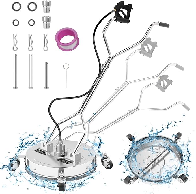 - 【DURABLE & HIGH PRESSURE】The pressure washer surface cleaner attachment is made from 304 indusrial grade stainless steel housing, featuring heavy-duty bearings and precision connections to ensure stable operation without leaks. Just glide this pressure washer brush over your sidewalk or driveway to easily blast away mold, dirt, and mildew using only water—no chemicals needed for a smooth pressure washing experience. For the best results, a pressure washer with 2500 PSI or higher is recommended.