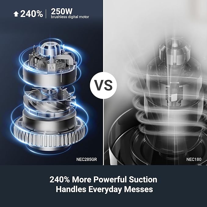- Efficient Cordless Cleaning: An upgraded 250W brushless digital motor with 240% more* powerful suction provides superior cleaning performance for everyday messes (*compared with NEC180).