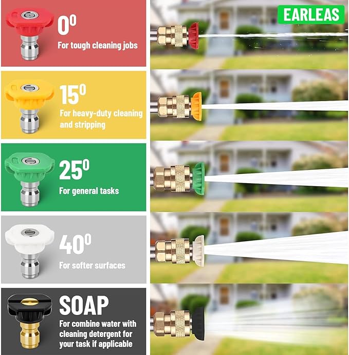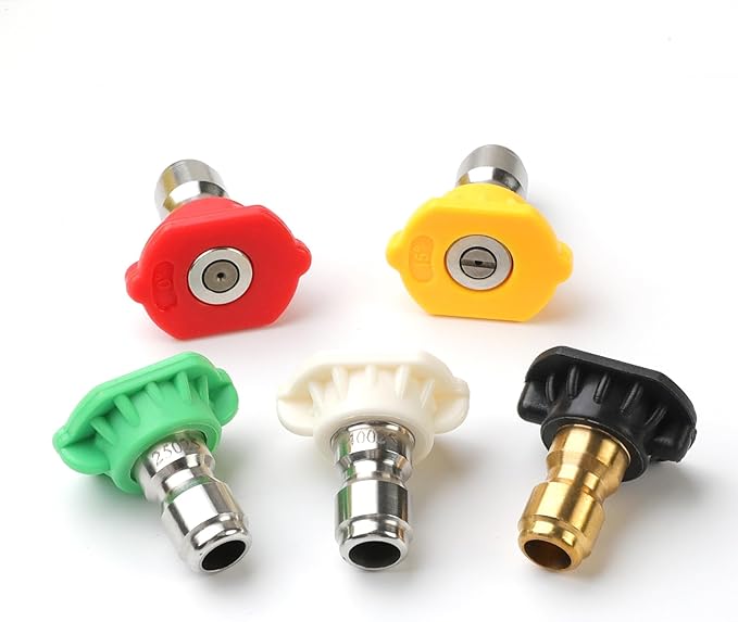 - THE COMPLETE 5-PIECE SET FOR ANY JOB: This is the only set you'll need. You get five versatile tips to handle everything from stripping grime to gentle washing: Red (0°) for pinpoint blasting, Yellow (15°) for tough surfaces, Green (25°) for all-purpose cleaning, White (40°) for delicate areas, and Black (65°) for soap application.
