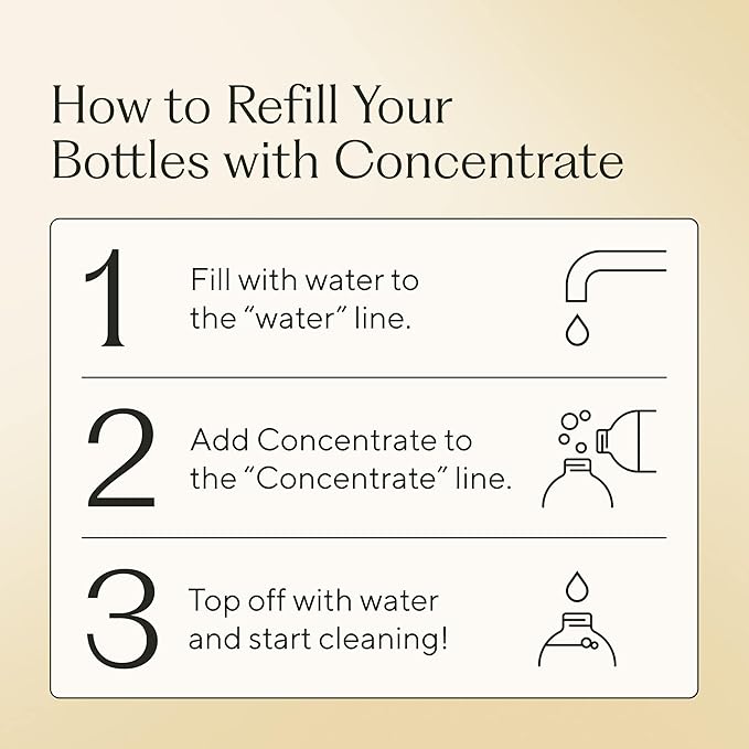 - EMPTY REFILLABLE SPRAY BOTTLES FOR EVERY TASK: The kit includes five clearly labeled empty refillable plastic bottles, each tailored to a specific cleaning task: All-Purpose (24 fl oz), Bathroom (24 fl oz), Streak-Free (24 fl oz), Foaming Wash (10 fl oz) and Laundry (32 fl oz). Simply mix the designated amount of Concentrate with water in each bottle for a powerful cleaning solution. Detailed instructions and fill lines are included on the bottles to ensure the perfect dilution.