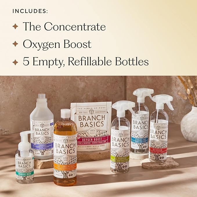 Branch Basics Premium Starter Kit: All Purpose Cleaner, Glass, and Bathroom Cleaner plus our Foaming Wash, and Laundry Bottle (3 Plastic Spray Bottles + Concentrate) Fragrance-Free