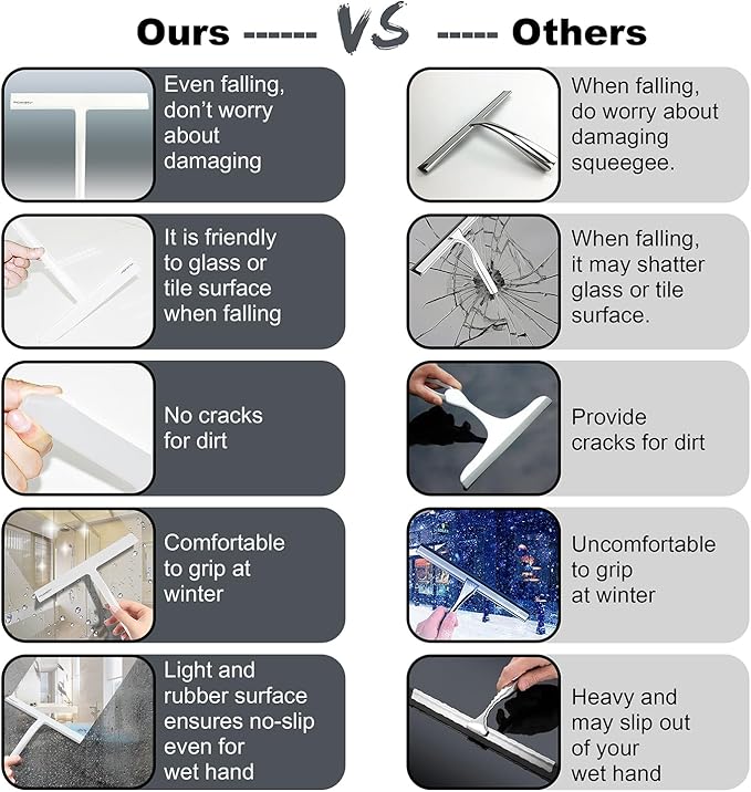 - 【Easy Storage & Use】: The window squeegee comes with 1 suction cup hook which can be attached to any smooth surface, you can hang the squeegee on the shower walls, kitchen and any other places for easy reach and use.