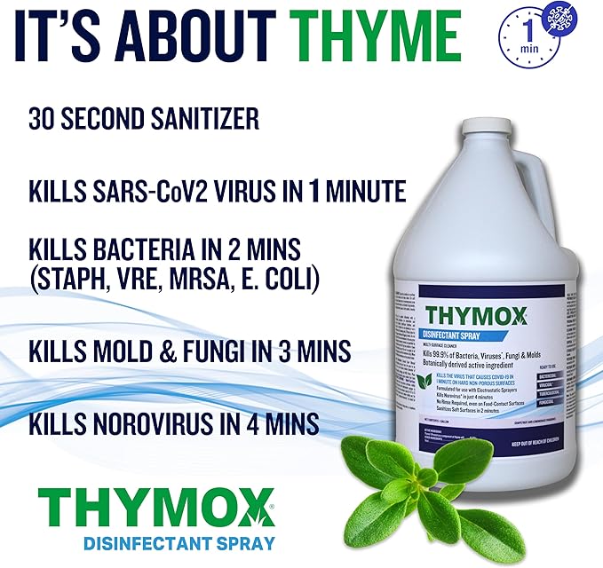 - All Natural and Pet Friendly: Thymox is a pet friendly cleaner and disinfectant, ensuring that your cleaning routine is safe for your furry friends. Utilize it as a thymes cleaning spray for water damage restoration, mold removal, and maintaining a clean and healthy environment.