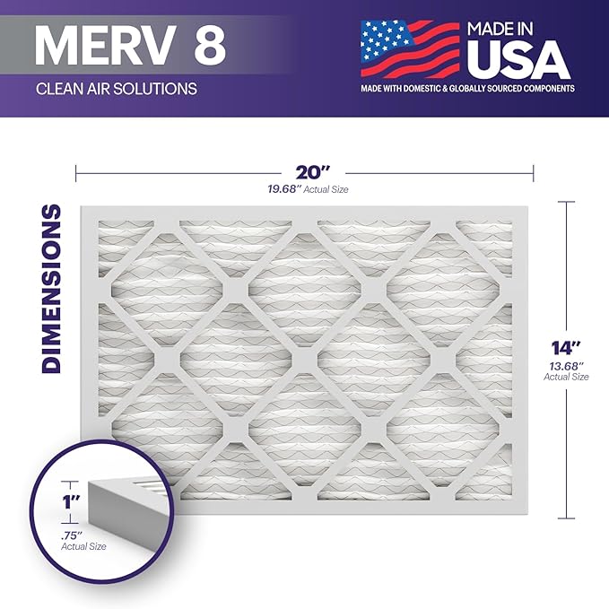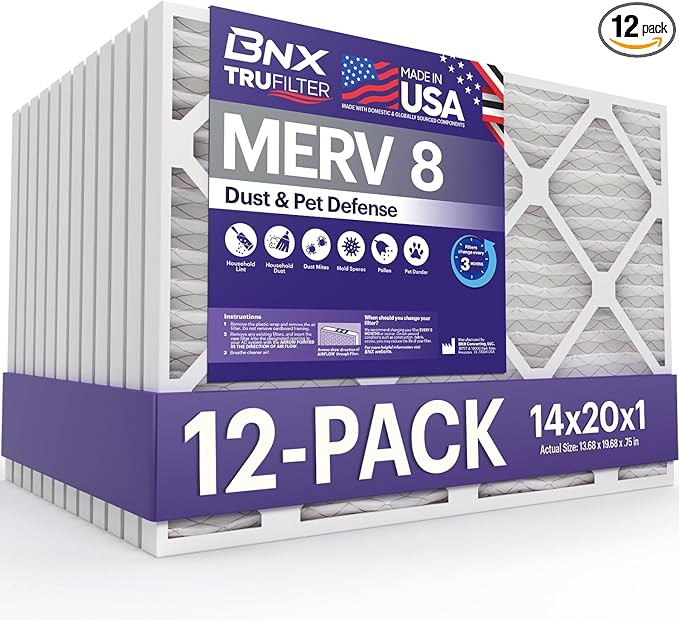 BNX TruFilter 14x20x1 Air Filter MERV 8 (12-Pack) - MADE IN USA – Dust & Pet Defense Electrostatic Pleated Air Conditioner HVAC AC Furnace Filters for Dust, Pet, Mold, Pollen MPR 600 – 700 & FPR 5
