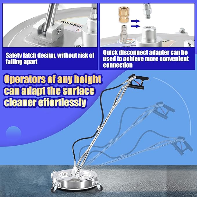 - HEAVY DUTY — Built with stainless steel all over, the pressure washer scrubber is durable to use. Splash-free skirt reduces overspray and keeps you dry while you clean. Adjustable handle makes the cleaner easier to control, saving your effort.
