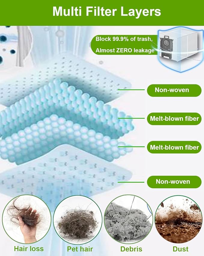 - High-efficiency Filtration System - The dust bag is made of superfine melt-blown fiber filter layer and non-woven fabrics layer with strong sealing property. High-efficiency filter can block 99.90% of dirt and debris, keeps the vacuum cleaner clean while auto-empty station is emptying garbage