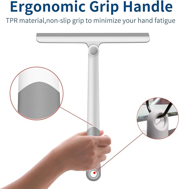 - ERGONOMIC NON-SLIP HANDLE – Wet hands are no problem. This handheld squeegee features a contoured, anti-slip grip that fits naturally in your palm, providing superior control and minimizing hand fatigue. The compact short handle design allows you to apply the perfect amount of pressure for a squeaky-clean finish in tight shower stalls.