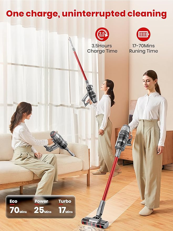 - [Long-lasting 70 minutes of battery life | Easily handle large apartments with one charge] VC14 has 8*3000mAh large-capacity rechargeable battery packs, which support up to 70 minutes of continuous work (ECO mode), meeting the deep cleaning needs of large apartments, duplexes or entire villas. Three power modes can be switched at will: ECO mode 70 minutes, MID mode 25 minutes, and MAX mode 17 minutes. Easily complete the whole house cleaning from floor to ceiling.
