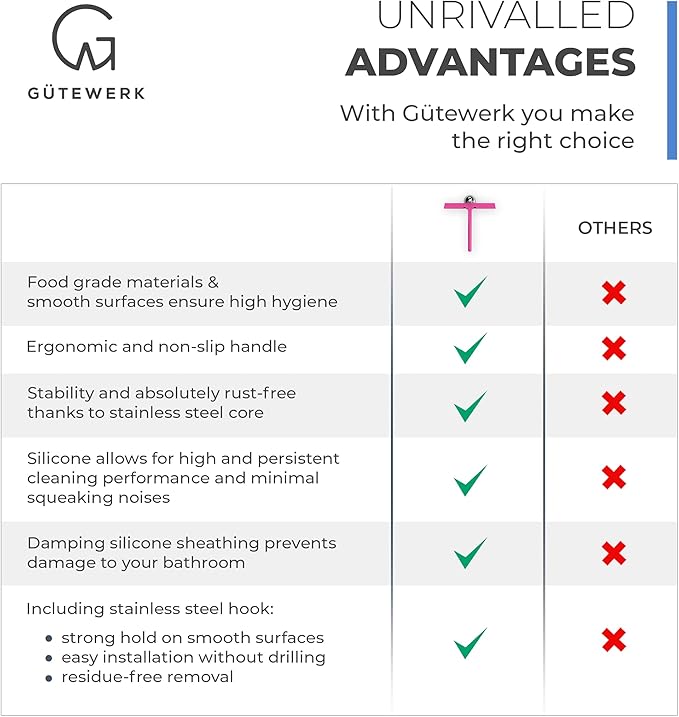 - MINIMALIST TIMELESS DESIGN - The GÜTEWERK glass squeegee is crafted with a matte black finish that impresses with its elegant timeless and smart design. In addition, the chrome-colored stainless-steel hook integrates well with any modern bathroom.