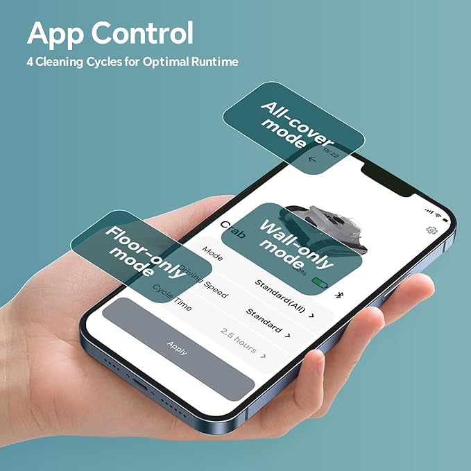 - Brushless Motor & Adaptive Climbing – Multi-Mode Cleaning:Powered by an energy-efficient brushless motor, this robotic pool vacuum delivers higher performance, longer lifespan, and quieter operation. It seamlessly climbs walls, floors, and waterlines, adjusting to different surfaces. With three selectable modes—Floor Only, Wall Only, and All-Cover Mode—it ensures a customized and thorough clean