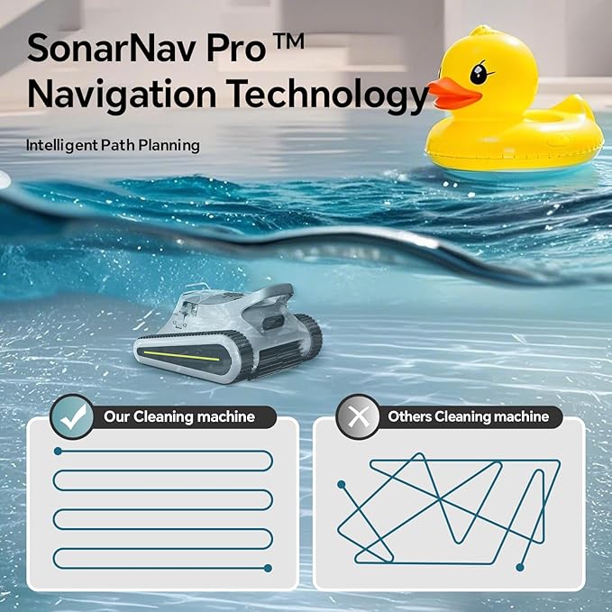 - Precision Navigation & Optimized Cleaning Path:Equipped with sonar-based route planning, this self-docking robotic pool cleaner intelligently scans and maps your pool for efficient coverage. By minimizing overlap and missed areas, it shortens cleaning time while ensuring thorough coverage across pools of all sizes and shapes.