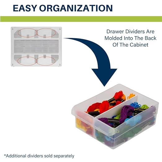 - DIVIDERS & MORE FEATURES: Drawer dividers are included and molded into the back of the cabinet; Stack cabinets securely or use keyhole slots to for wall mounting; Finger-grip drawer pulls provide easy access; Rear stop tabs prevent contents from spilling