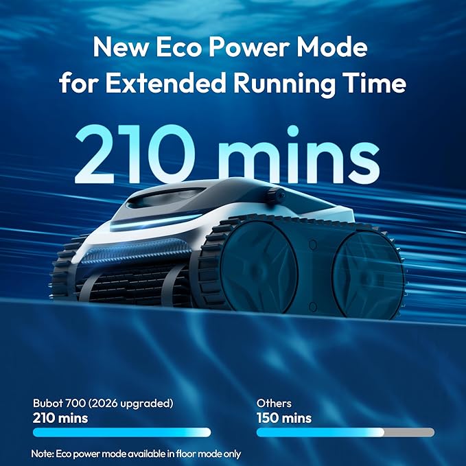 - AI Powered Navigation & Self Parking: With our new Bluesonic Path Tech, Bubot 700 pool cleaners for inground pools maps your pool intelligently for maximum coverage—using an N shape path for walls and an S shape path for floors. When the battery runs low, it auto parks at the pool's edge for effortless retrieval.