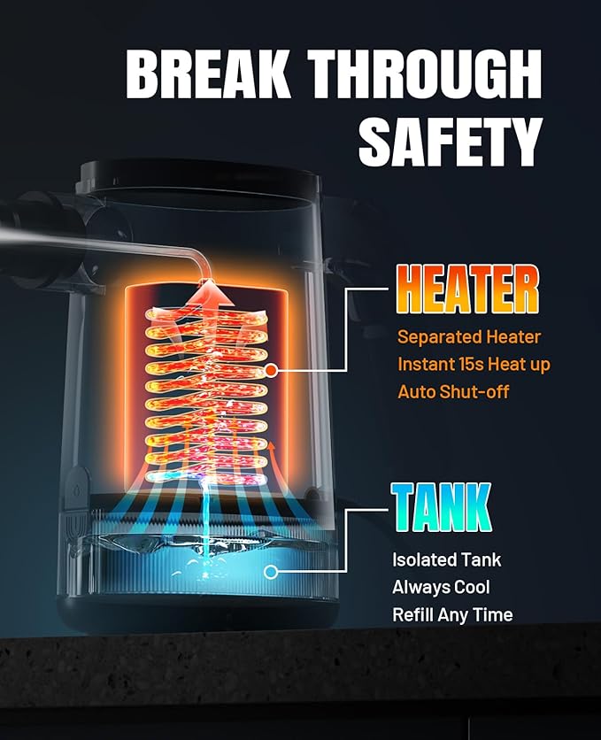 - UPGRADED SAFETY WITH ISOLATED TANK: All electrical and heating parts are fully isolated from the water, preventing issues like backflow, sudden brusts , and the need to wait before refilling. The transparent tank lets you check water levels at a glance, and you can refill anytime without interruption