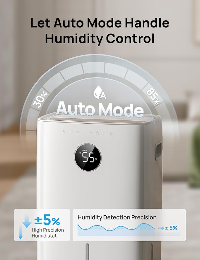 - Accurate Humidity Control: The DREO Dehumidifier adapts to your needs with three customizable modes(Comfort/Auto/Continuous Mode) for optimal moisture control. In Auto Mode, simply set your target humidity level—the built-in high-precision humidity sensor intelligently adjusts between low/medium/high speeds to maintain your desired humidity within a 5% tolerance.
