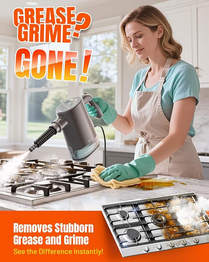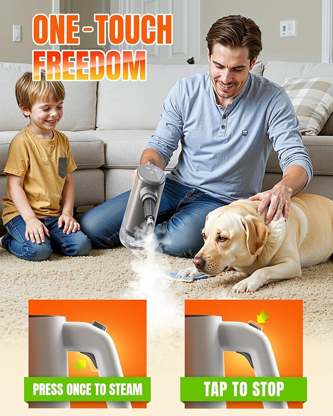 - Lockable & Free Your Thumb Control: This steam cleaner features intuitive touch control, allowing you to easily adjust steam intensity with a simple tap. With a lockable trigger, so you no longer need to press or hold a button—just set it and go!
