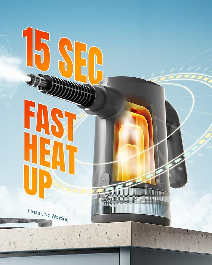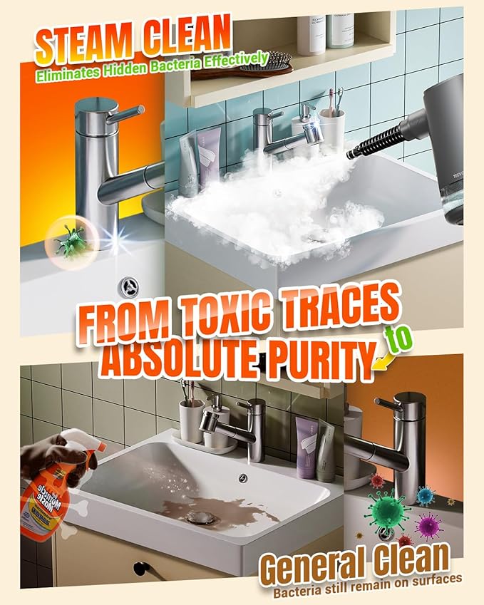 - 15 Seconds Fast Heat-Up : The TEEVOGO 1200W handheld steam cleaner heats up in just 15 seconds, delivering 230°F high-temperature steam for immediate cleaning results. It generates strong, pressurized steam to remove built-up gunk from bathroom grout, floor, kitchen corners, and other tight spots